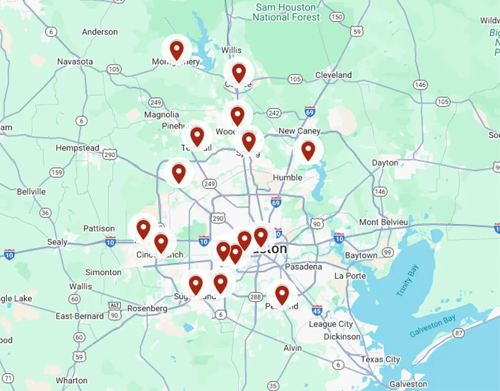 Bellaire,Champions, Cinco Ranch, Conroe, Cypress, Katy, Kingwood, Missouri City, Montgomery, Pearland, River Oaks, Spring, Sugar Land, The Woodlands, Tomball.